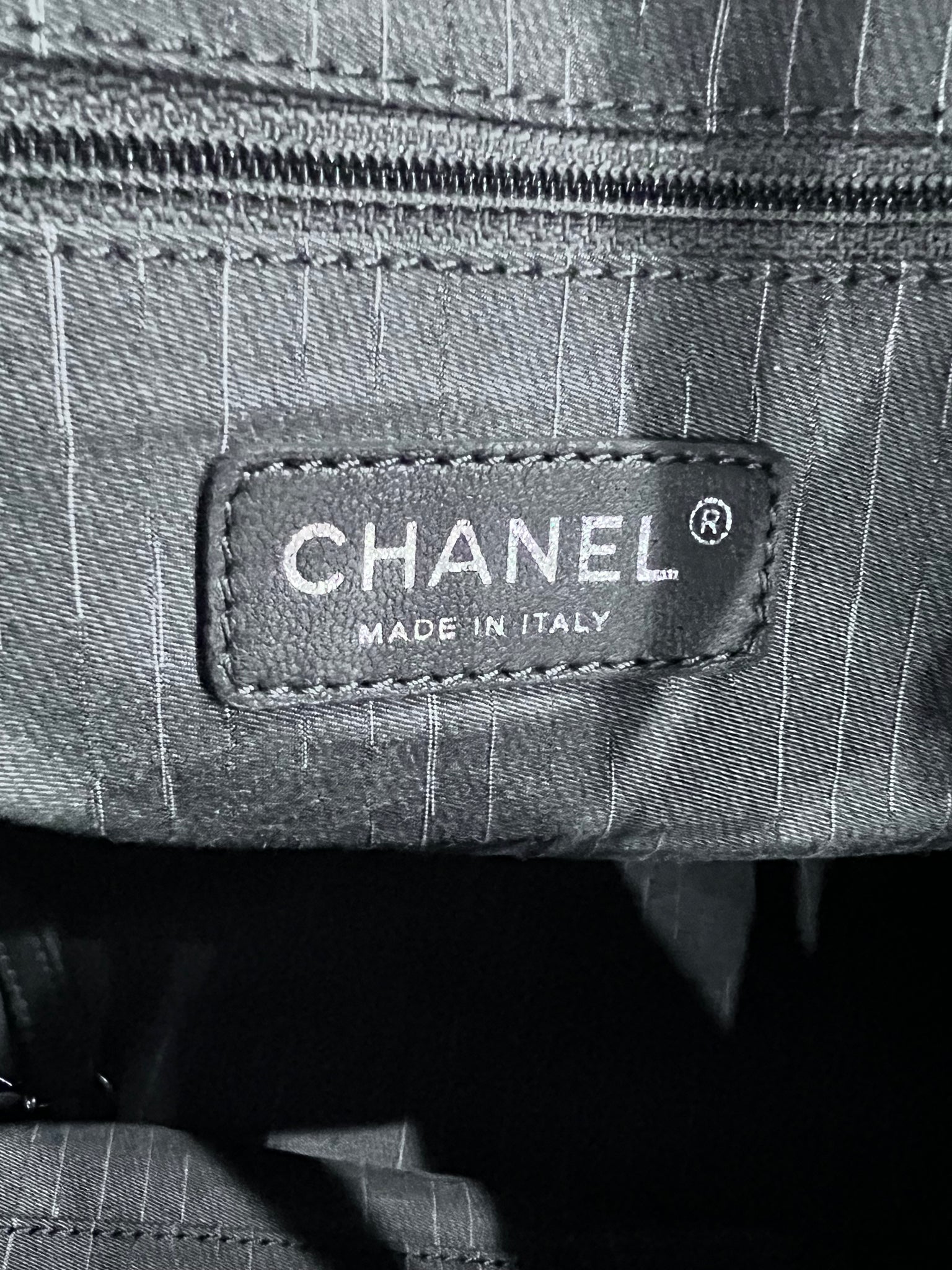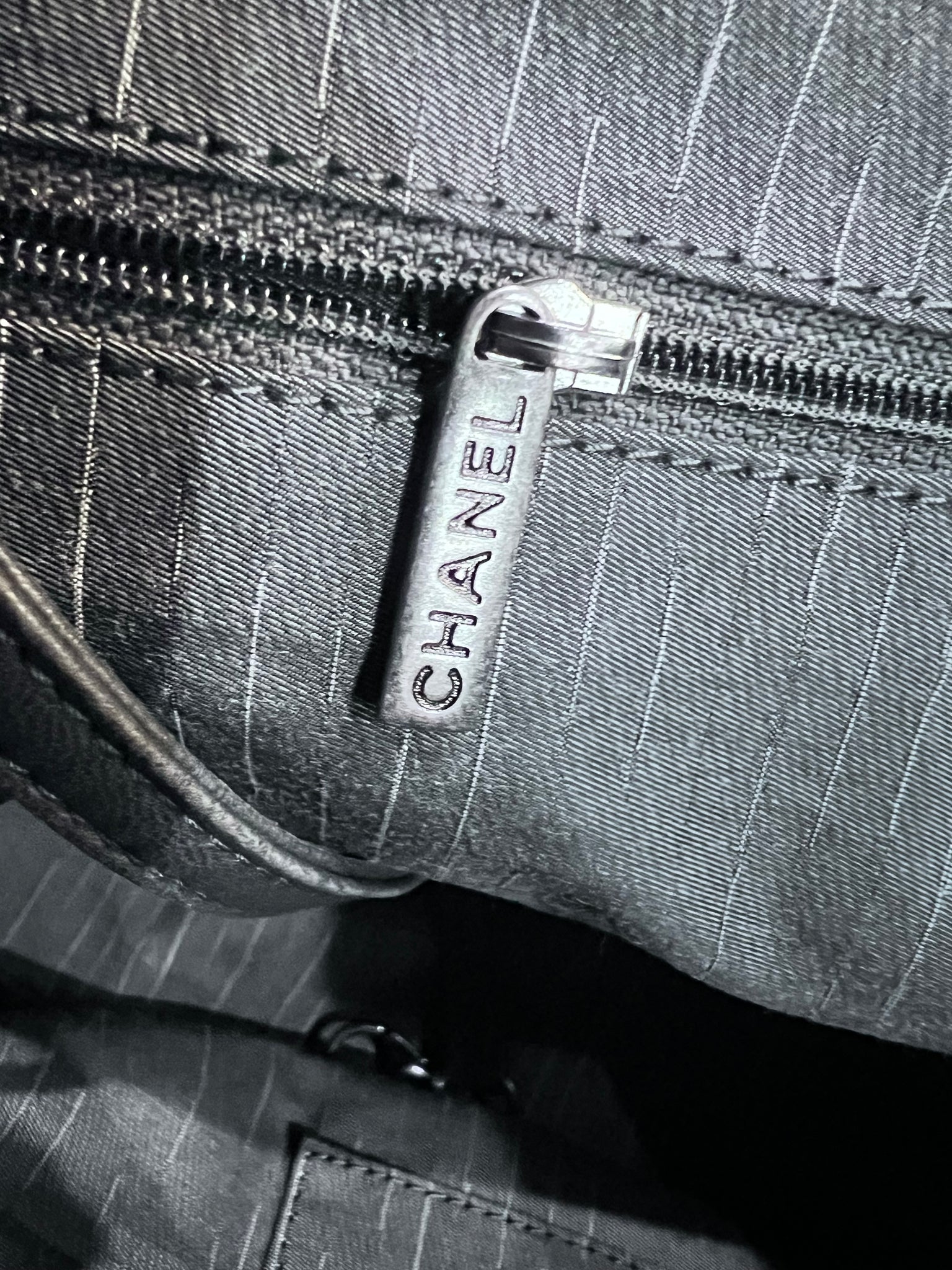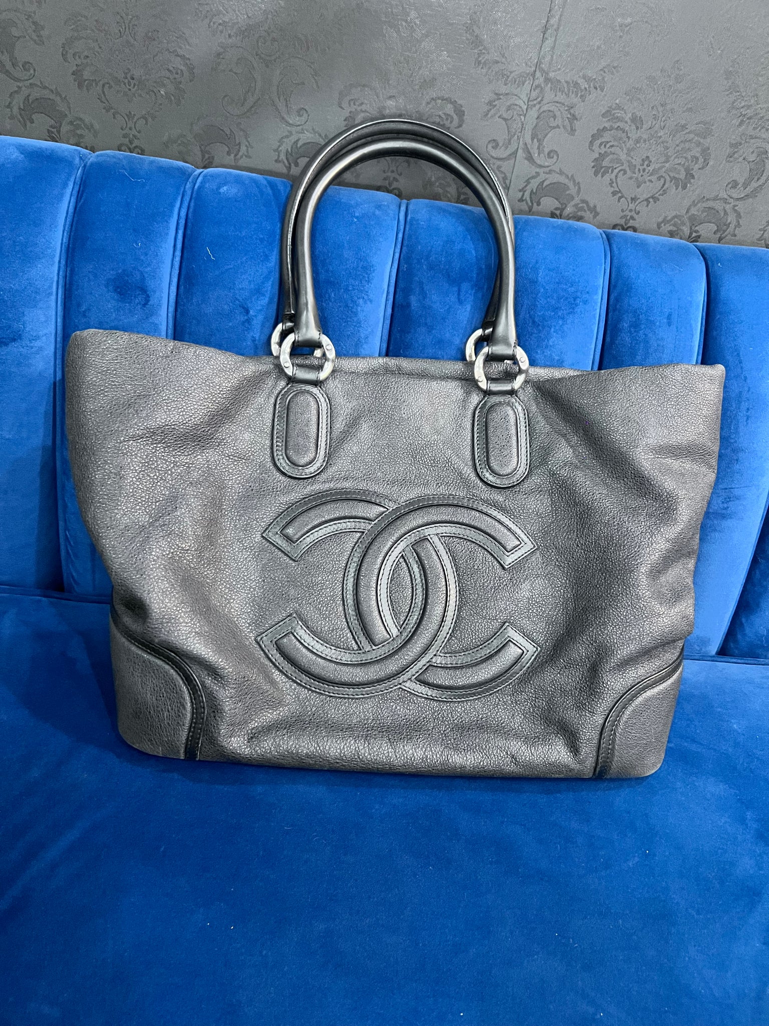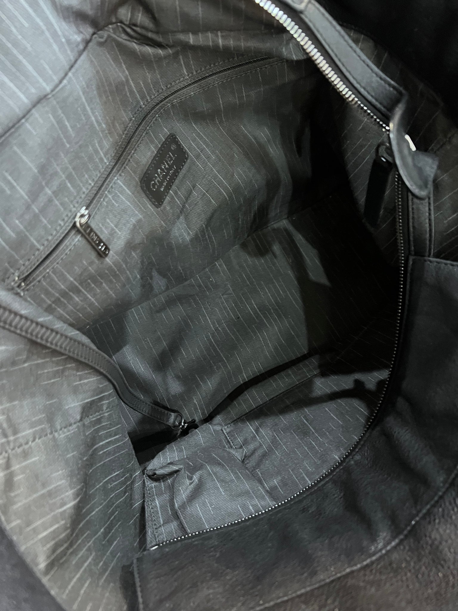 CHANEL Washed Calfskin Leather Timeless Large Tote Bag crafted in supple black calfskin leather and ruthenium hardware. Featuring rolled leather top handles, a large signature 'CC' logo at center and a top-center zipper closure. The top of the bag is open to a spacious interior finely lined in a striped gray fabric with zip and patch pockets.