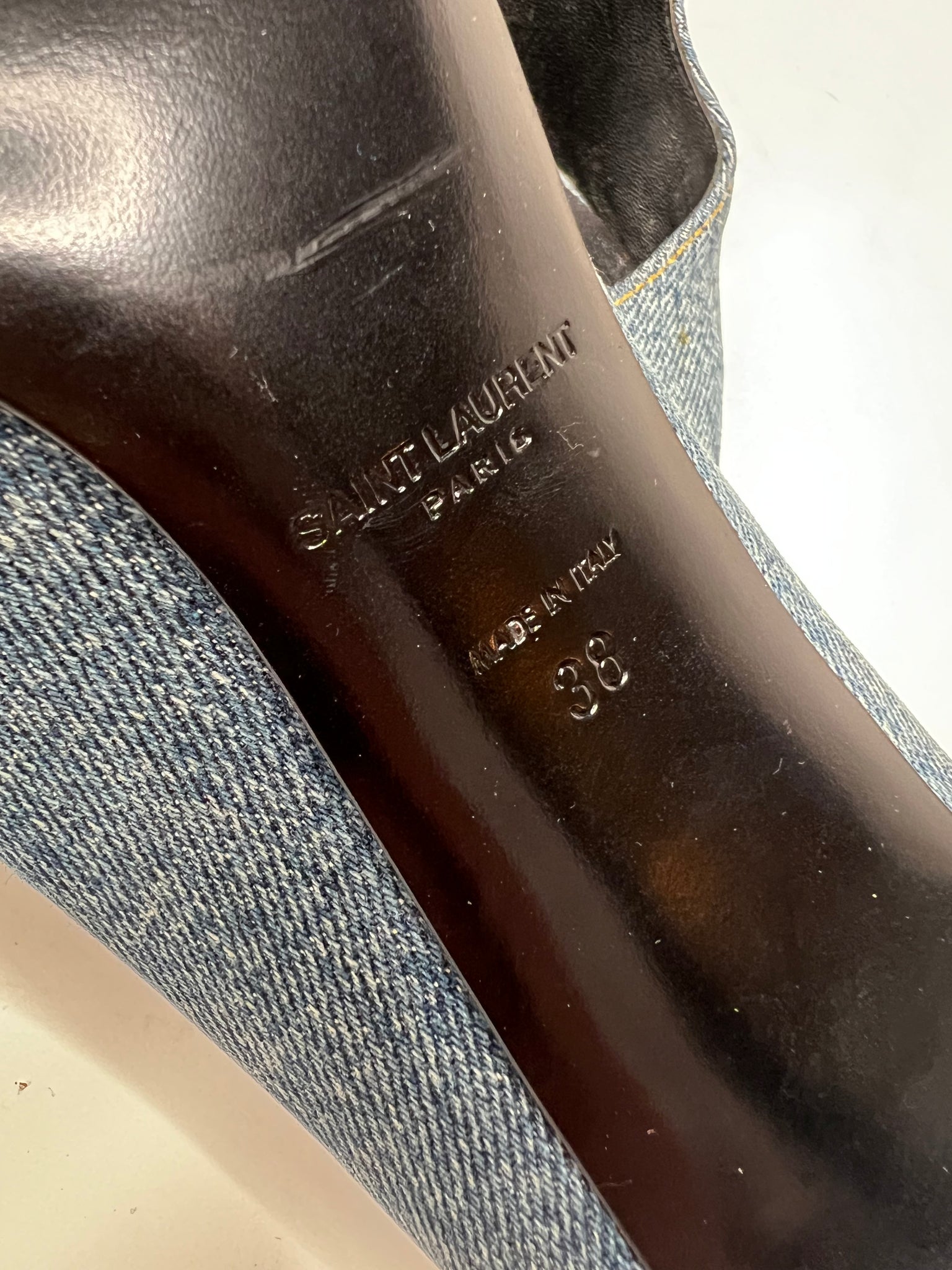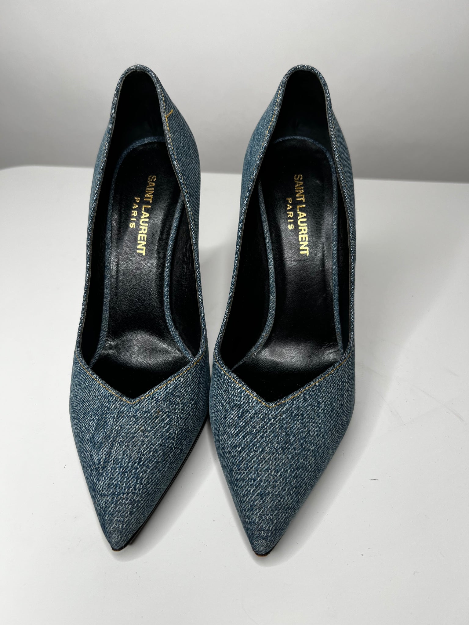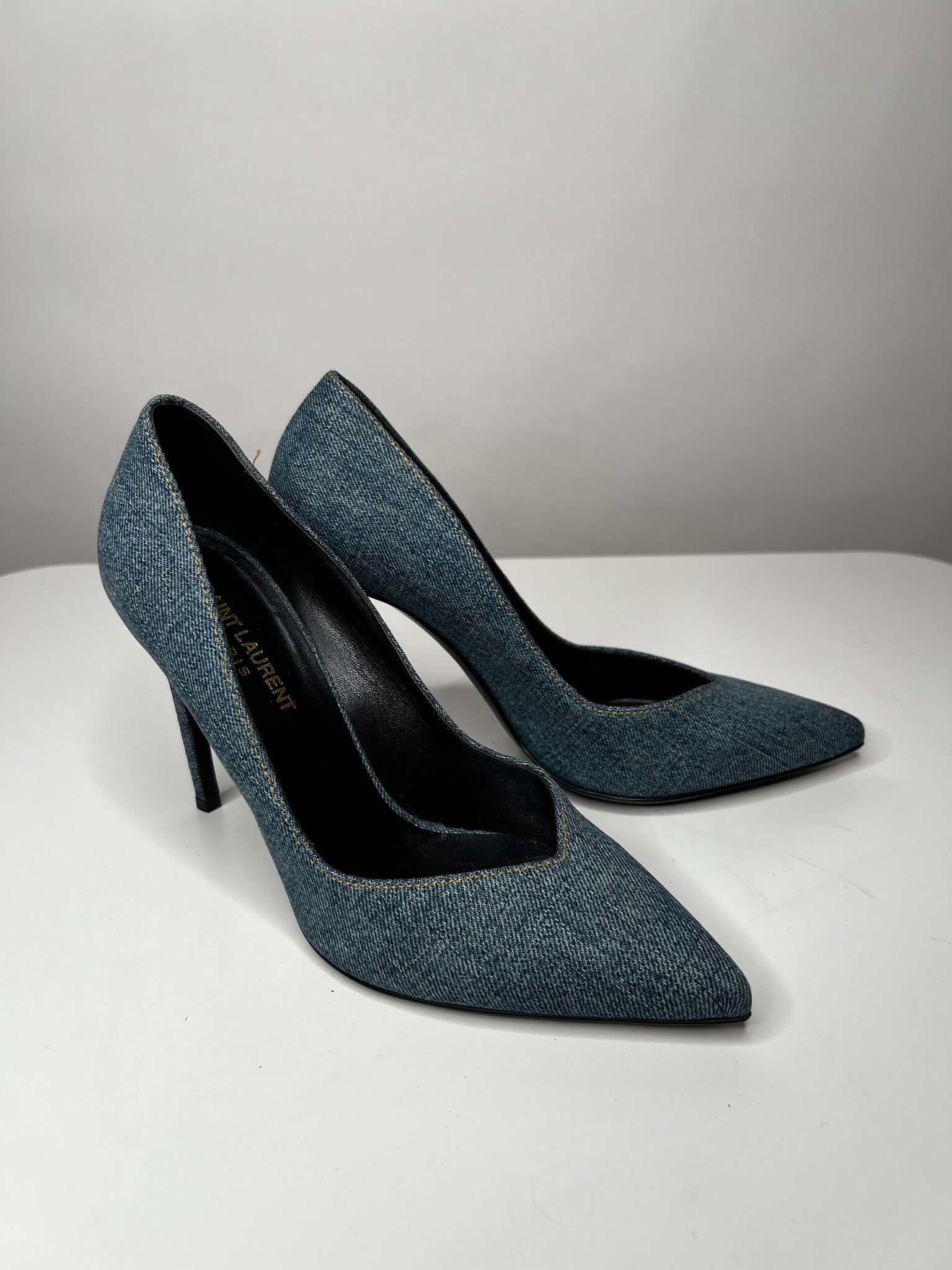 Meet your new neutral-with-a-twist. These authentic Saint Laurent pumps are wrapped in classic blue denim with sleek black leather lining and a sharp pointed toe—effortlessly elevating everything from white tees to tailored suiting.
